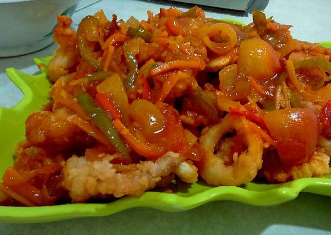 - Masukkan cumi goreng ke dalam saus. Aduk rata hingga cumi terbalut dengan saus.